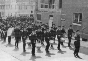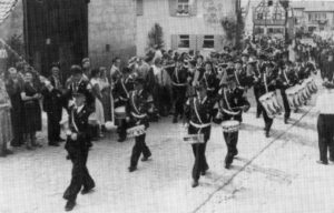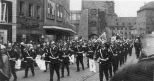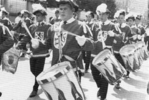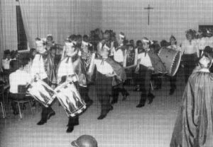 Er bildete die Trommler aus und am 26.4.1952 konnte dann das Trommlerchor zusammen mit der Kapelle das erste Mal an die Öffentlichkeit treten. Der Anlaß dazu war die Weihe der Joseph-Statue in der Adalbert-Stifter-Straße. Nicht von der Seite der Trommler wich der damalige Gerichtsvollzieher Hans Lang, der immer mit Rat und Tat zur