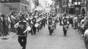 Mehrere junge Kameraden aus der aktiven Mannschaft traten dem Spielmannszug bei. Das bedeutete, dass weitere vier Fanfaren und die ersten zwei Landsknechttrommeln angeschafft wurden. Im April 1959 entschloss man sich zu dem Trommlerchor und der Bläsergruppe auch noch eine Pfeifergruppe aufzustellen. Auch hier hatten wir großes Glück. Sehr viele junge Leute erklärten sich bereit, zu ihrem aktiven Dienst auch noch im Spielmannszug tätig zu sein. Unser Spielmannszug wurde immer größer und wurde bald darauf über die Landkreisgrenze bekannt. 1960 kaufte man dann die ersten Fanfarentücher die das Wappen der Stadt und der Feuerwehr trugen.
